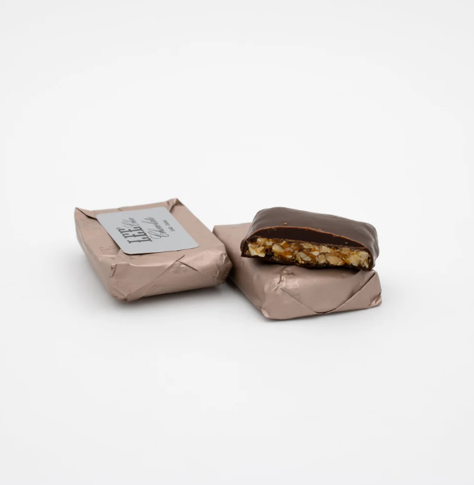 Zutaten: Zucker, Kakaomasse, Kakaobutter, Vollmilchpulver, Magermilchpulver, Sojalecitihn (E322), Vanillin, Haselnuss, Mandel, Pistazien, Walnuss, Cashew, Erdnuss.