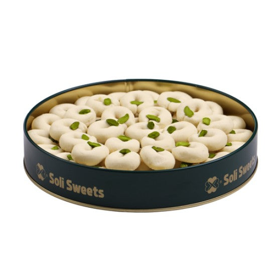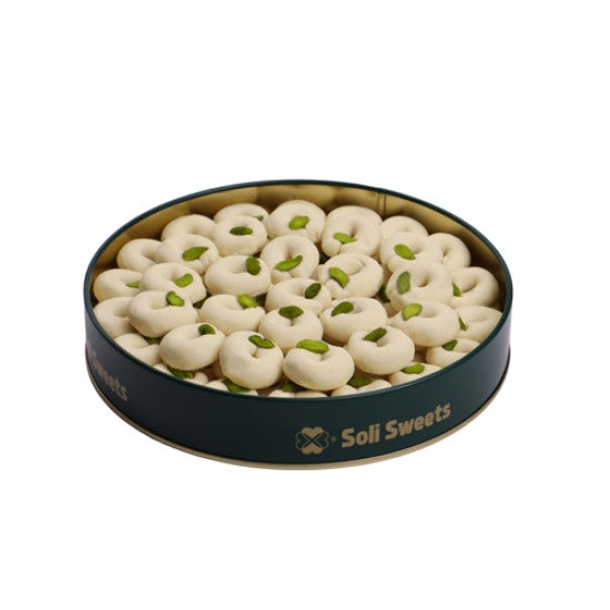 400g (85 Stück) Ghriba Shamiya (Siniora): Kleine Ringe aus Mehl- und Grießteig, mit den besten Ghee-Sorten gebacken und mit hervorragenden grünen Pistazien dekoriert.